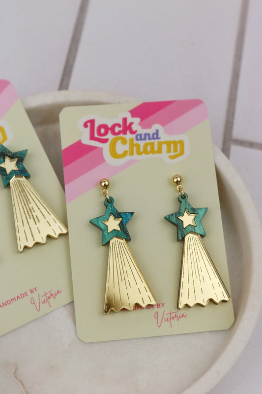 Gold & Marbled Blue Shooting Star Acrylic Earrings