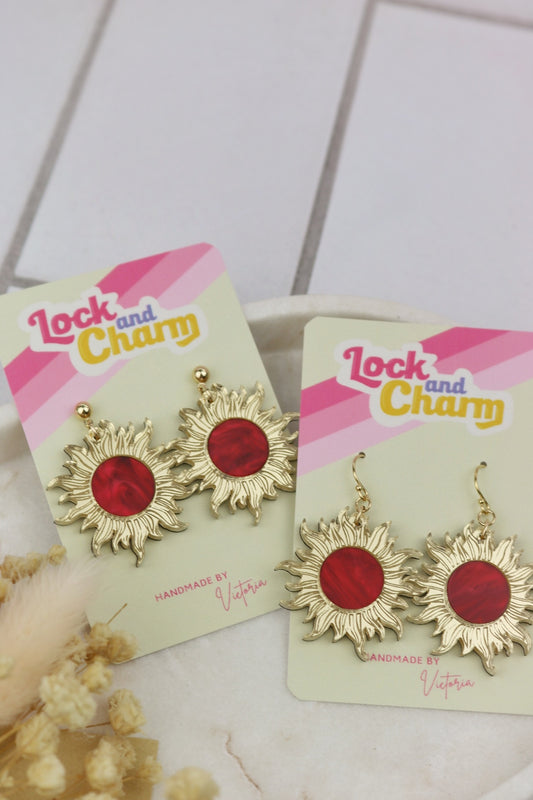 Red Marbled Centre Gold Sun Acrylic Earrings