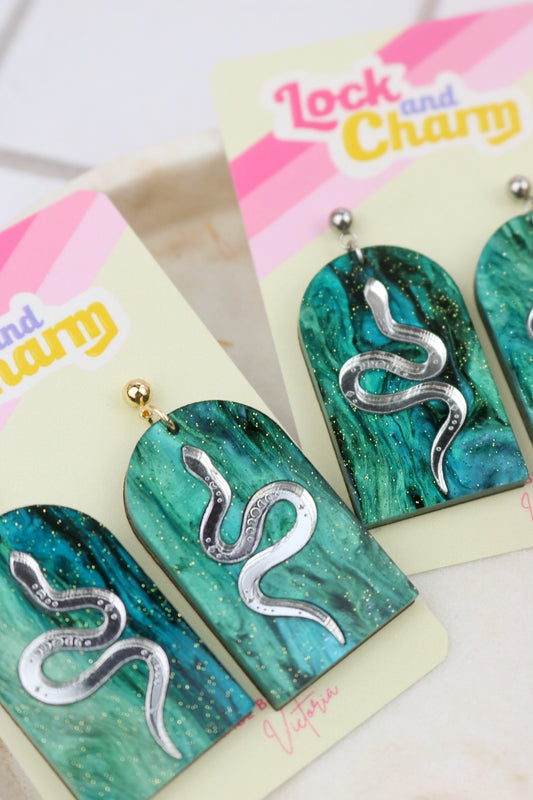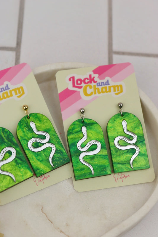 Green Marbled Acrylic Statement Snake Arch Earrings