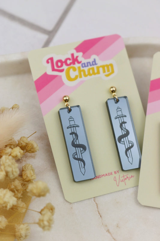Engraved Sword and Snake Acrylic Rectangle Earrings
