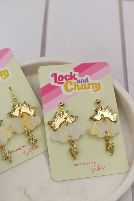 Gold Sun, Cloud and Lightning Bolt 3 Tier Acrylic Earrings