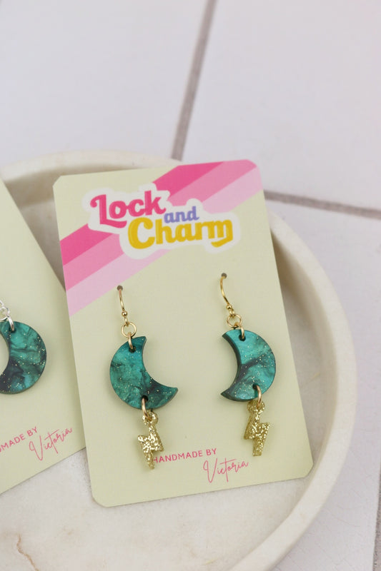 Blue Marbled Moon with Lightning Bolt Acrylic Earrings