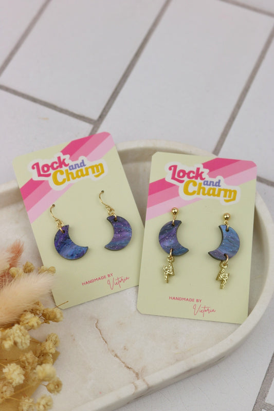 Purple Marbled Moon with Lightning Bolt Acrylic Earrings
