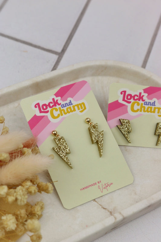 Gold Glitter Sparkly Lightning Bolt Acrylic Earrings