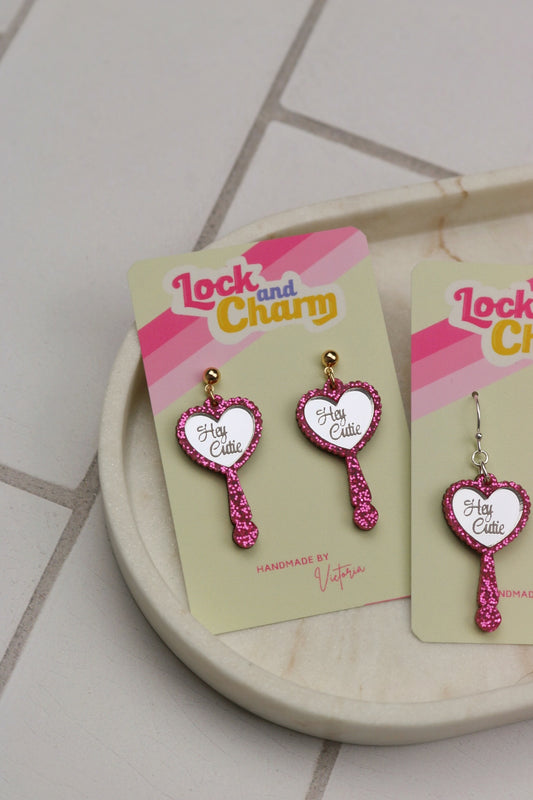Pink Sparkly 'Hey Cutie' Hand Mirror Acrylic Earrings