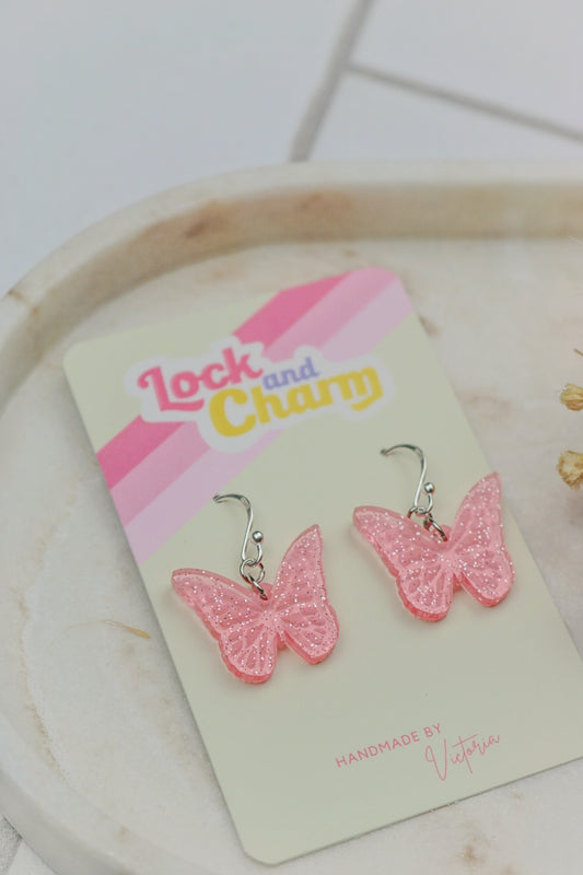 Pink Glitter Sparkly Acrylic Butterfly Earrings